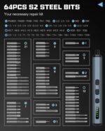 - Comes with 64 precision bits covering 10 categories (e.g., Torx, Phillips, Flathead).